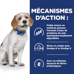 Cet aliment est spécialement formulé avec des protéines de soja hydrolysées et une basse teneur en matières grasses afin d’éviter les réactions indésirables aux aliments, tout en favorisant la santé de la peau chez les chiens présentant des sensibilités alimentaires ou aux graisses. Enrichi de la technologie révolutionnaire ActivBiome+ de Hill’s, dont il a été cliniquement prouvé qu’elle active rapidement le microbiome intestinal pour favoriser la santé digestive et le bien-être global."