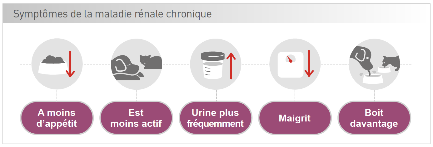 Les premiers symptômes apparaissent seulement lorsque l'animal a déjà irrémédiablement perdu 75% de sa fonction rénale.