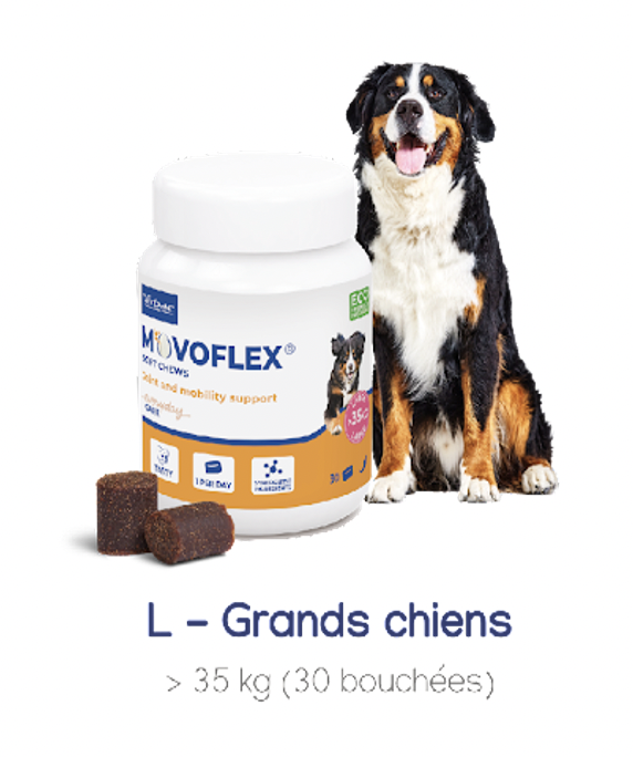 Découvrez Movoflex, aliment complémentaire hyper appétent pour soutenir la mobilité et le confort articulaire des chiens en 3 formats pour un dosage optimal.